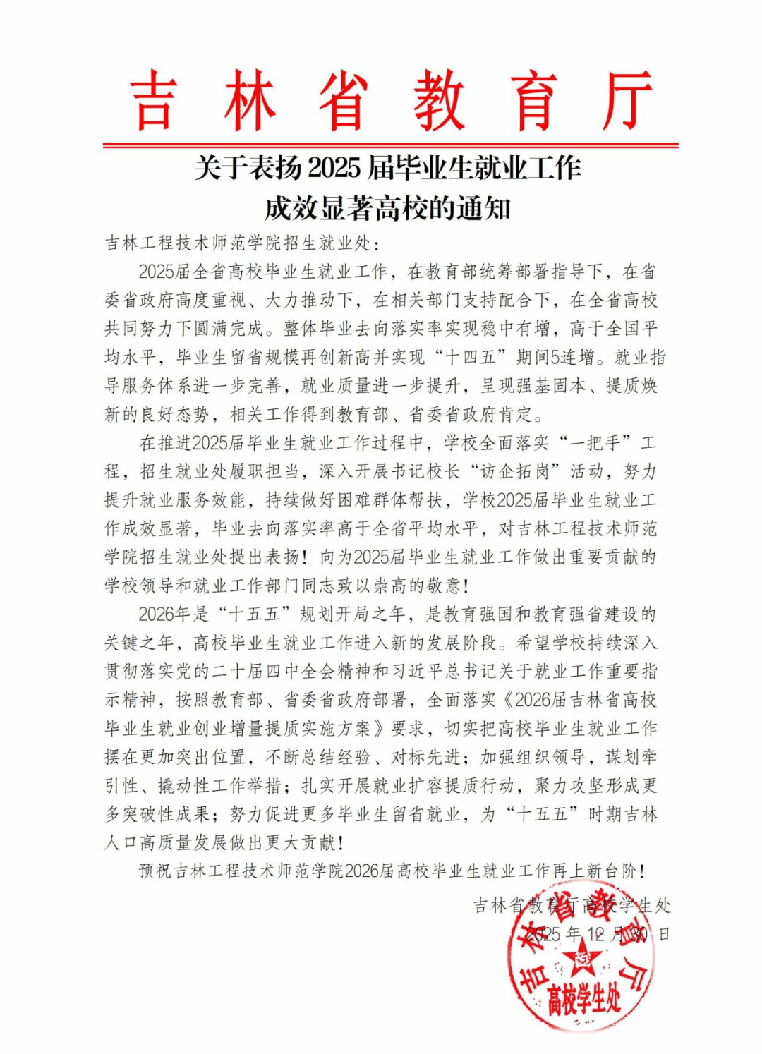 近日,吉林省教育厅向我校发来《关于表扬2025届毕业生就业工作成效显著高校的通知》,对学校2025届毕业生就业工作给予充分肯定和表扬。