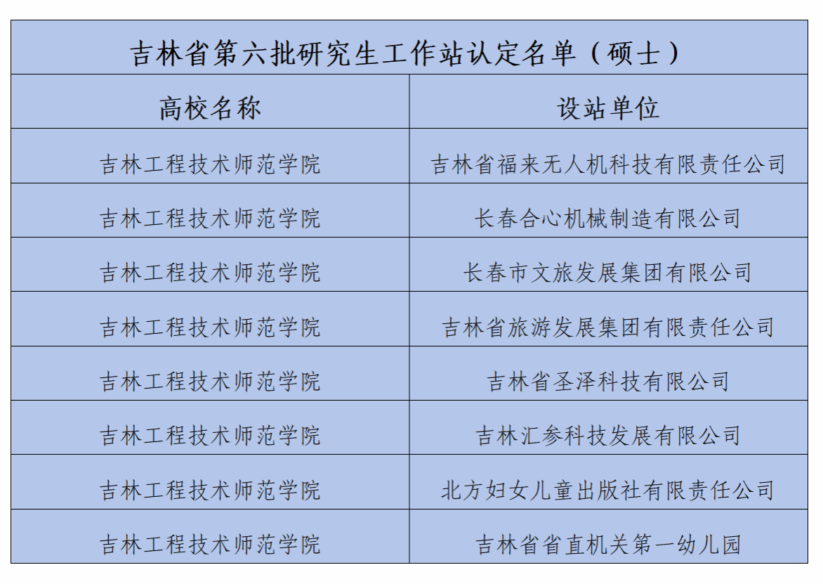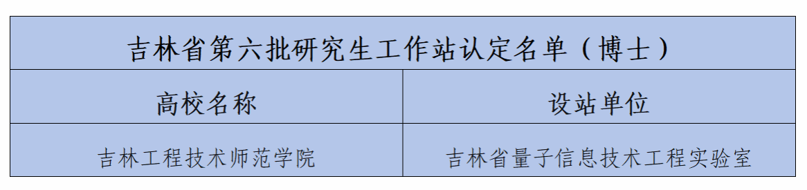 近日,吉林省教育厅发布了《关于公布第六批吉林省研究生工作站的通知》,我校成功获批9个省级研究生工作站,其中博士研究生工作站1个、硕士研究生工作站8个。本次获批的博士研究生工作站设站单位为吉林省量子信息技术工程实验室;硕士研究生工作站包括吉林省福来无人机科技有限责任公司、长春合心机械制造有限公司、长春市文旅发展集团有限公司、吉林省旅游发展集团有限责任公司、吉林省圣泽科技有限公司、吉林汇参科技发展有限公司、北方妇女儿童出版社有限责任公司、吉林省省直机关第一幼儿园等8家单位。