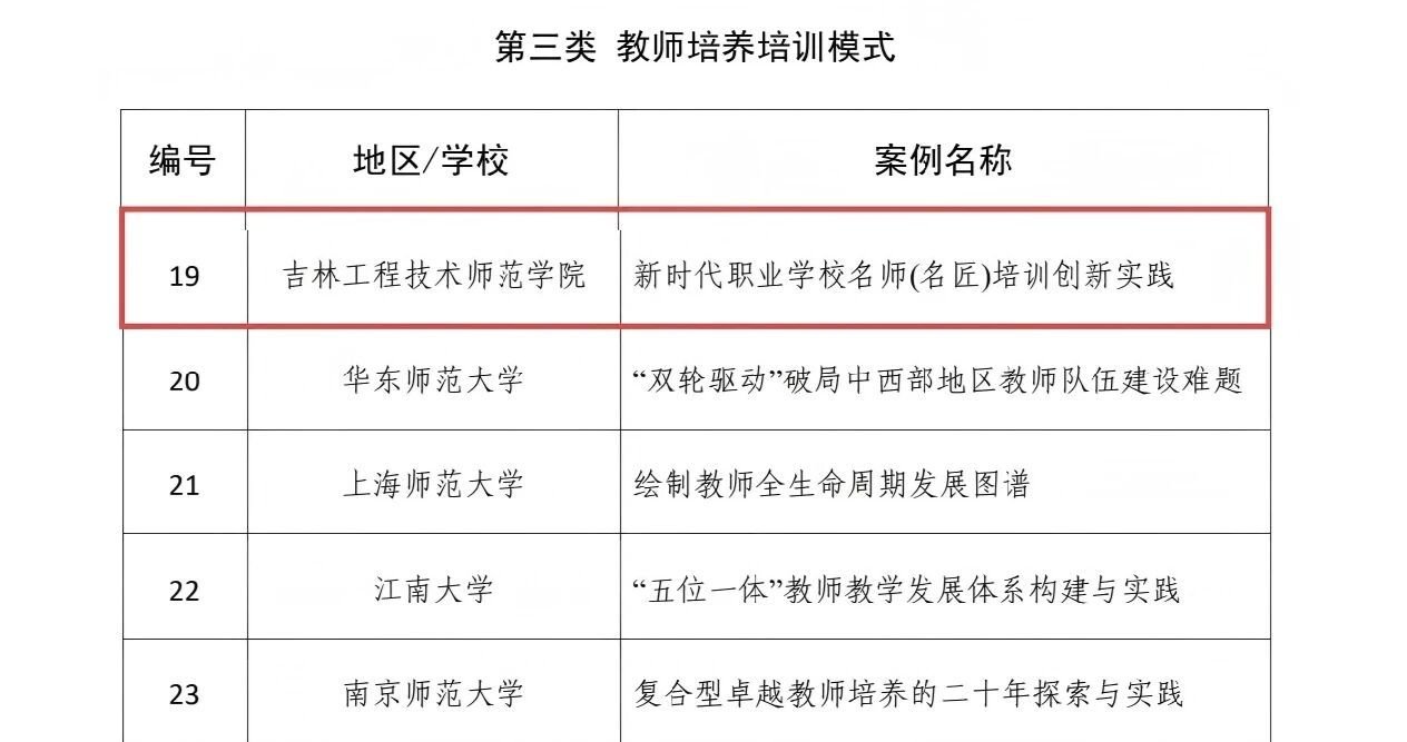 日前,在教育部教师工作司指导下,由中国教育报刊社牵头组织征集、编制的“新时代高水平教师队伍建设创新案例(2025)”正式发布,吉林省共有4所高校案例成功入选,我校位列其中。