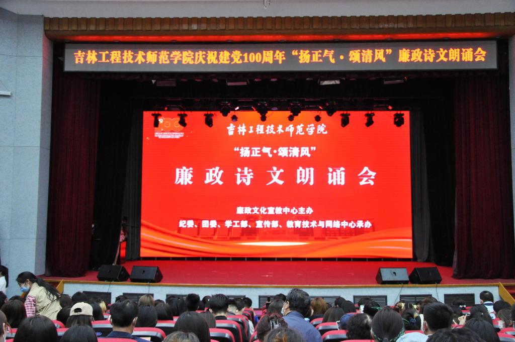 5月26日,我校在报告厅举办庆祝中国共产党成立100周年“扬正气·颂清风”廉政诗文朗诵会。吉林省校园廉洁文化联盟发起单位、吉林农业大学纪委副书记赵明家,吉林省校园廉洁文化联盟2021年廉心向党主题演出导演组负责人、吉林农业大学团委书记彭雨石,学校纪委书记、监察专员左伟,副校长张鹏,党委副书记陈景翊,副校长宋立军出席朗诵会,全校师生代表500余人齐聚一堂,共同观看了诗文朗诵会。