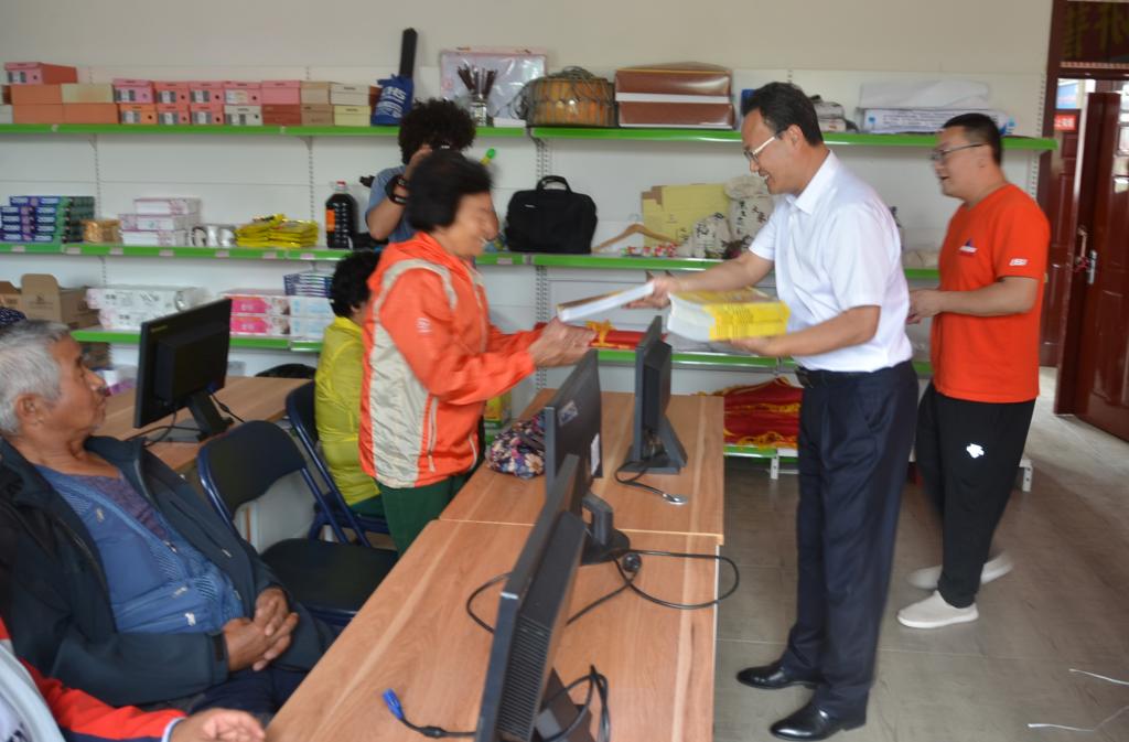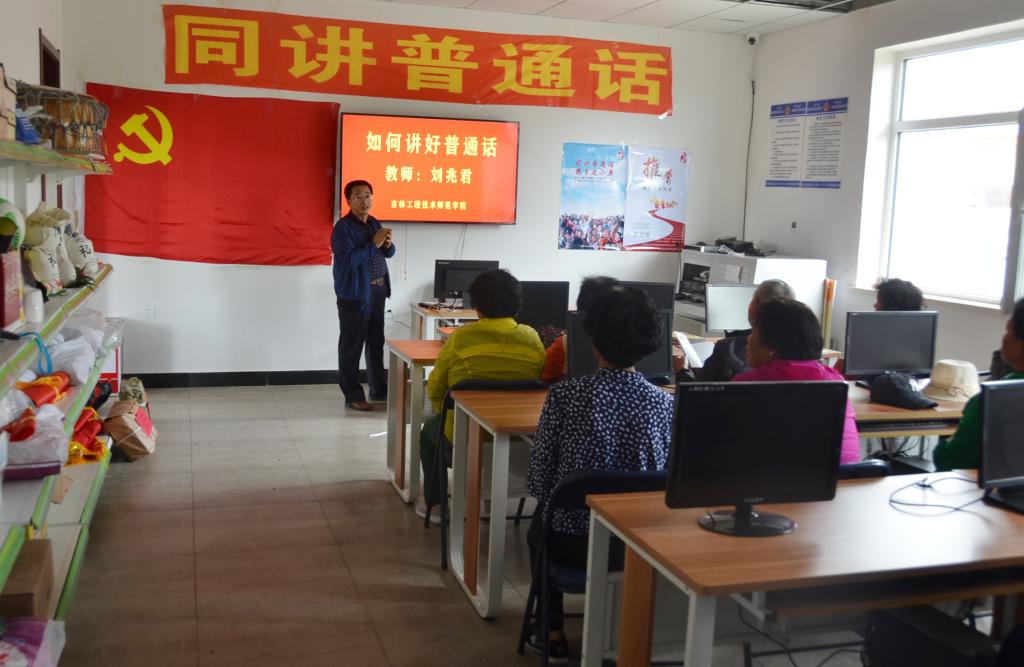 考察结束后学校领导一行来到廉明村村部,参加推普脱贫活动。在推普脱贫活动中,副校长张鹏发表了讲话,并把带来的普通话类、科技类书籍和“云听”卡捐献给村民,希望村民的普通话水平越来越好、科技能力越来越强,早日脱贫;传媒学院副教授刘兆君老师为村民上了如何讲好普通话的推普课,宣讲了说好普通话的重要意义,宣传了普通话知识,并表达了希望村民早日进小康的祝愿。