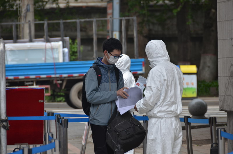 学生到校后,在校门口按照规划好的路线行进,凭返校回执、身份证明,经过测温、扫吉祥码、审核身份等程序进入校园。学生接受健康复查,确认符合健康规定后,到指定区域进行报到注册,工作人员审核学生行程信息,为符合返校条件的学生发放健康包及公寓出入证明。