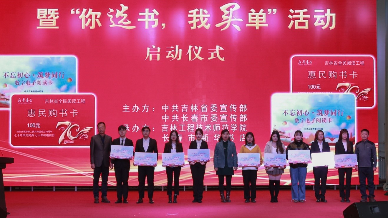 本次活动在诗歌朗诵《书韵》中拉开序幕。吉林省委宣传部出版处处长李彦生、副处长金润在,长春市委宣传部出版印刷发行管理处长马艳红,长春市新华书店总经理宋孟林,学校党委宣传部部长武德峰,传媒学院院长陈少志共同按动了“你选书,我买单”活动启动球,并向大学生代表发放了惠民购书卡和电子阅读卡。