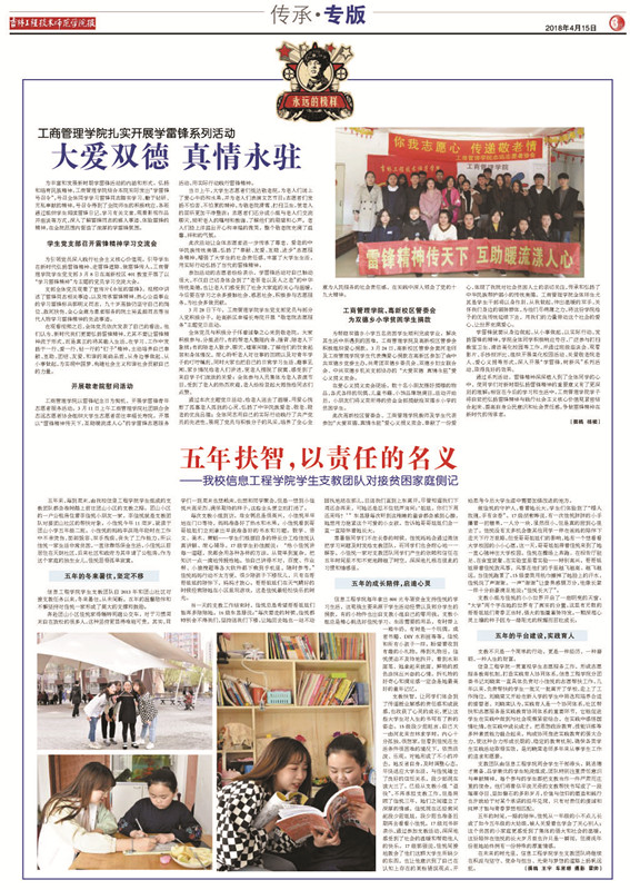 由王宇、车昱珊撰写的《五年扶智,以责任的名义———我校信息工程学院学生支教团队对接贫困家庭侧记》获通讯类一等奖;由周颖编辑的《绘事回眸》获版面类一等奖;由李梦园、司家艺、袁美恒拍摄的《交流访问》获新闻摄影类一等奖;由付韵霏、张欣编辑的《走进大凉山,小排的第二次支教之旅》获微信微博类一等奖,由张玮东、付韵霏撰写的《重阳时节割稻忙》获通讯类二等奖;由王宇编辑的《畅想专版》获版面类二等奖;由李思奇撰写的《十年一觉诗词梦》获副刊作品类二等奖;由王宇拍摄的《书画作品展》获新闻摄影类二等奖。