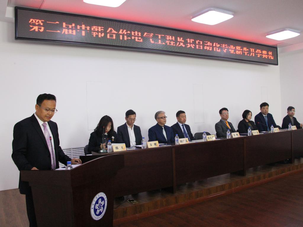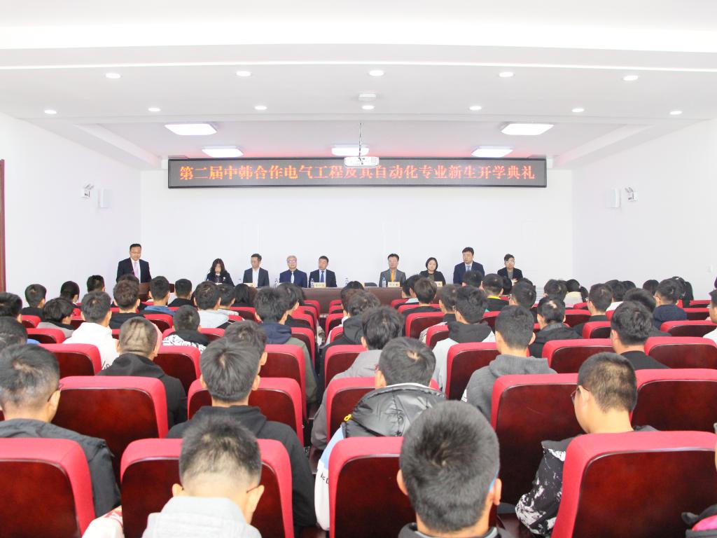 典礼开始,全体师生起立奏唱国歌,张鹏致辞,对远道而来的庆一大学总长鄭鉉泰先生等韩方代表表示诚挚的欢迎,并介绍了过去的时间里中韩合作项目取得的成功以及学院的发展历史和基本情况。正值吉林工程技术师范学院建校60周年,他指出,中韩两校持续在教育教学和学生发展方面精诚合作,使两校电气工程及其自动化专业深厚的办学底蕴相结合,继续帮助同学们在“一带一路”格局下和不断变化的全球经济中培养所需的行业技巧与能力,为同学们创造更加广阔的发展空间和学习天地。同时张校长也向同学们提出了几点希望,希望广大新生树立远大、正确的理想,学会把读书、思考、实践有效的结合起来,从而提高自身综合素质和就业竞争力。