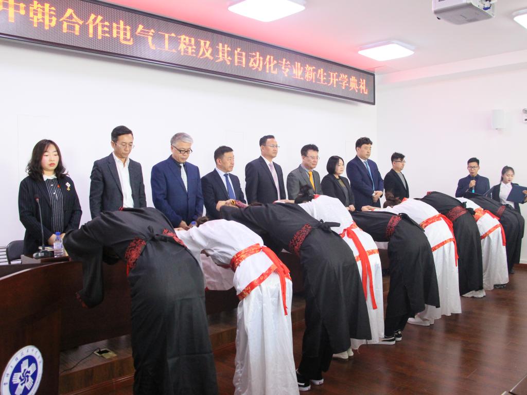 之后由2019级中韩合作电气工程及其自动化专业新生向中韩双方老师行拜师礼,并向老师们敬送了拜师礼物,老师们也向学生回赠了儒家经典著作《大学》,并由学子共同诵读,朗朗的诵读声中表达出了对老师的尊敬和感恩,对学业严谨刻苦的态度,以及对未来宏图的期盼和展望。拜师礼过后,由教师代表和新生代表分别发言,教师代表电自教研室主任李聪老师为同学们接下去的大学生活提出了几点建议,她建议同学们,多阅读启迪心智的经典名著,多用理性眼光审视现成的结论,并希望同学们能够珍惜此次学习机会,切实做到志存高远、修养品格,充分发挥国际学生的优势,成为通晓国际规则,能够在国际上竞争,拥有中韩国际教育背景的高素质应用型创新人才。新生代表电气工程及其自动化专业1941班张馨予同学则表示将来会勤奋刻苦,努力拼搏,不负家长和老师们的殷切希望;不负时代的使命;不负大学的使命,与新时代同行,努力把自己培养成为具有执着的信念、优良的品德、丰富的知识、过硬的本领的有用之才,以社会主义建设者和接班人的使命担当,为全面建成小康社会、全面建设社会主义现代化强国而努力奋斗。