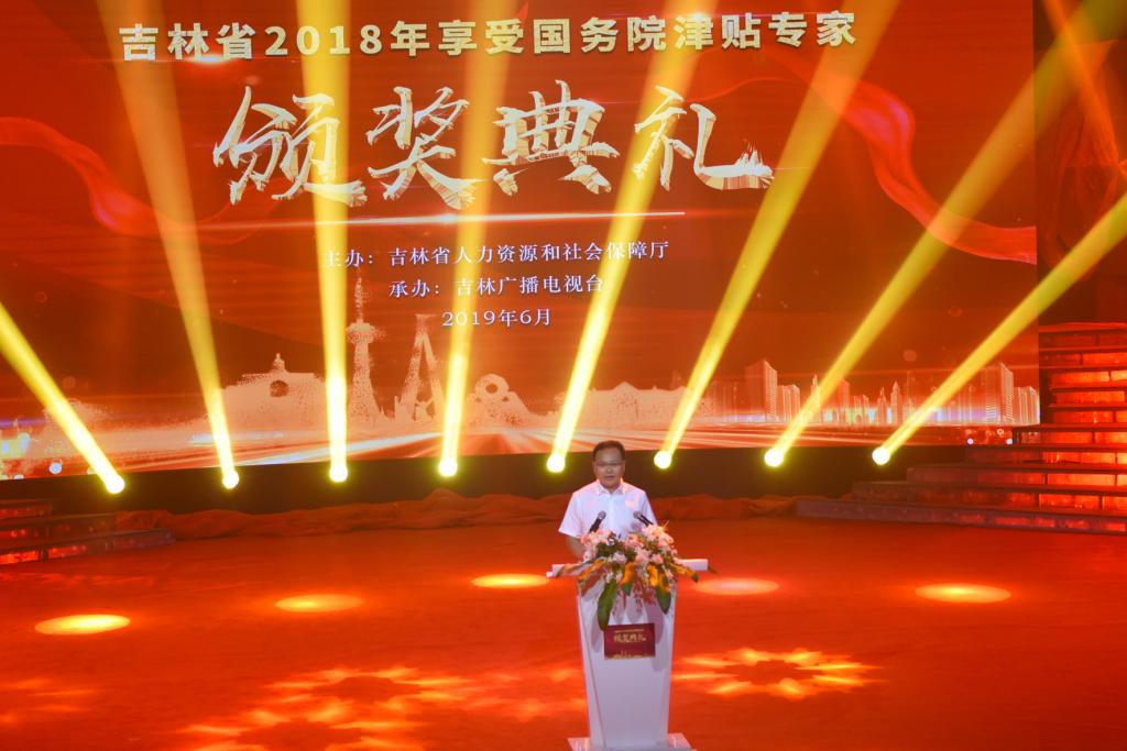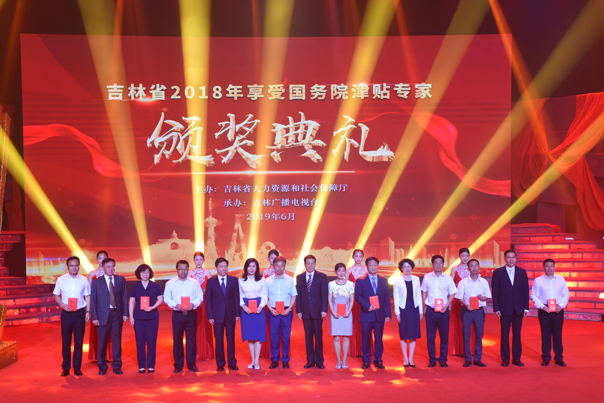 6月28日,吉林省享受国务院政府特殊津贴专家颁奖典礼在吉林电视台广电大厦演播大厅举行。省政府、省委组织部、省人社厅领导及55位2018年获得国务院政府特殊津贴专家参加典礼。