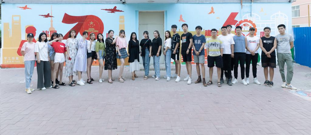 这次壁画创作选在学校主校区第二公寓的墙面上,整体底色为天蓝色,内容上将新中国成立70周年与建校60周年结合起来。用标志性建筑、军人剪影、鸽子等意象展现多年来祖国发展、学校成长的风雨历程,以及取得的光辉成就,与五爱教育之“我爱国防”征兵宣传中的爱党、爱国、爱家的涵义相呼应。