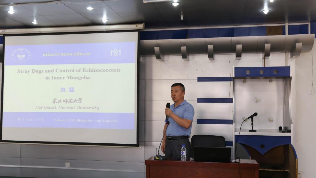 崔亚新处长在会议上致欢迎辞,他希望全体参会人员能在此次会议中博采学术、增进交流、开拓视野、收获友谊,通过研讨会加强各校和院系之间的长期合作,共同推动微分方程与动力系统及相关领域的学术研究。研讨会邀请了四位专家作学术报告,分别是:范猛教授报告题目为《Stray Dogs and Control of Echinococcosisin Inner Mongolia》;Zhisheng Shuai博士报告题目为《Dynamical Systems on Networks and their Applications: Perspectives from Population Dynamics》;杜润梅博士报告题目为《退化抛物方程的能控性》;我校左佳斌老师报告题目为《Existence and multiplifity of solutions for fractional Kirchhoff type problems》。