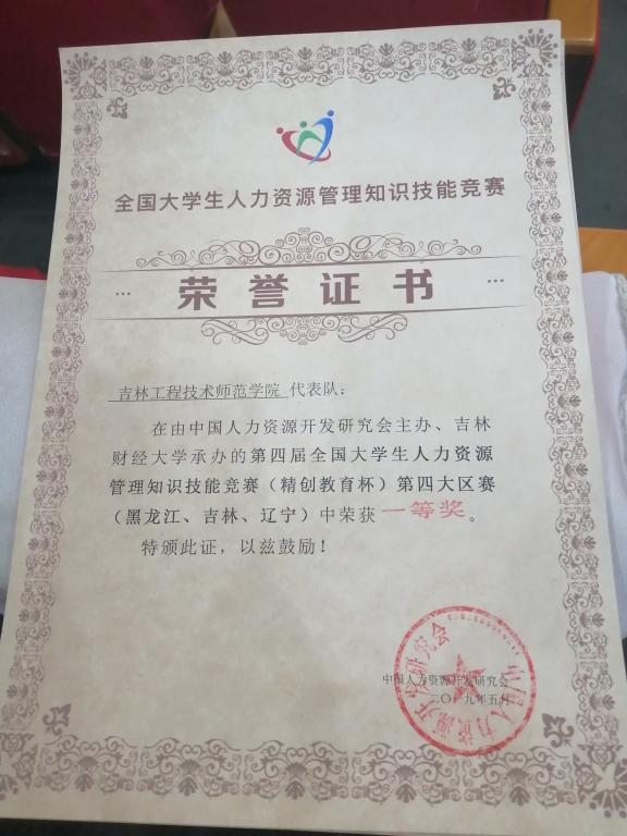 我校代表队由工商管理学院人力资源教研室罗青兰、行政管理教研室董丽担任指导教师,由人力资源管理1641班刘维譞、姜子捷,人力资源管理1741班朱志远,行政管理1641班冷国宇四位同学组成的队伍参加此次人力资源管理专业知识技能竞赛,他们在比赛中不畏强手,敢打敢拼,一举获得大赛一等奖。