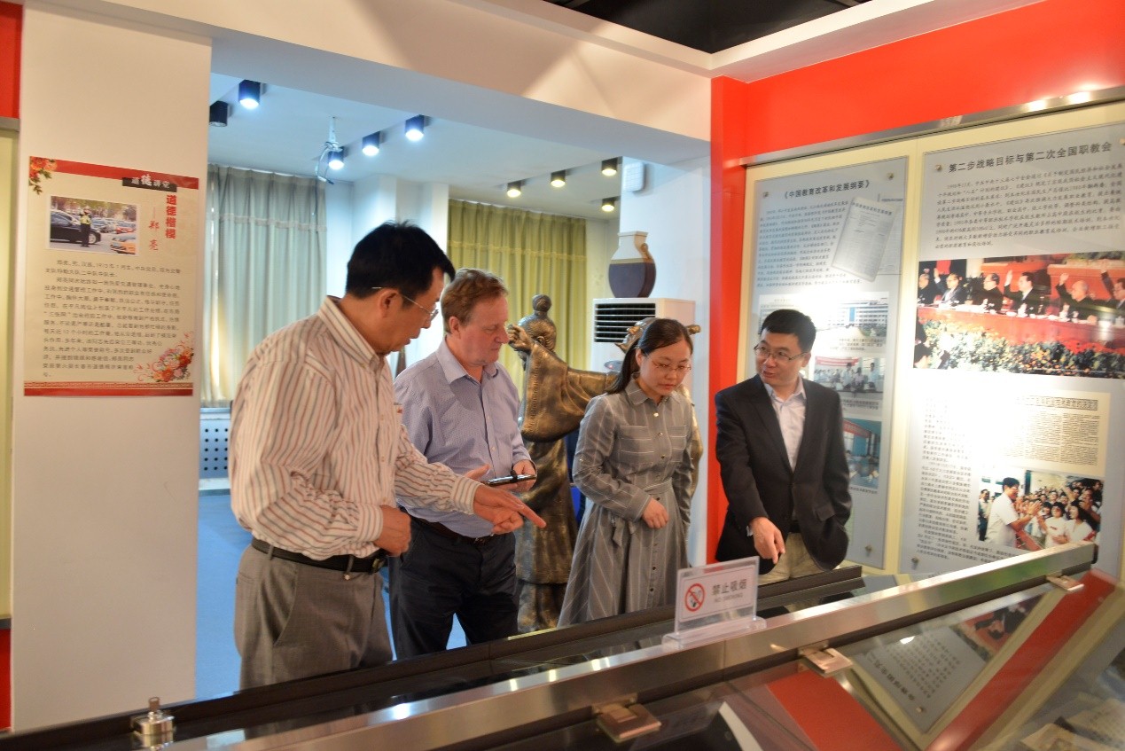 Ken Spours教授和苑大勇博士对中国现代职业教育史馆、职业教育发展数据库和数字化职业教育博物馆进行了参观。他表示,中国现代职业教育史馆通过实物和展览的方式记录职业教育的发展历程是非常有意义的,这非常有利于面向未来开展职业教育研究,以及更加科学的政策制定,他感到非常震惊,英国没有类似的机构,这种做法值得英国学习和借鉴。他将就我校的这一做法专门撰文,向英国推广。参观结束后,又开展了主题为“第四次工业革命和人工智能:未来的工作和终身学习”的学术研讨会,我校科研处处长崔亚新、教育科学学院院长于志晶以及教育科学学院的老师和职教研究院的研究人员参加了研讨会,就当前新革命背景下的职业教育改革发展进行了交流。会议还就未来在学术出版、建设国际学术共同体等方面进行了广泛的探讨,形成初步战略合作框架。