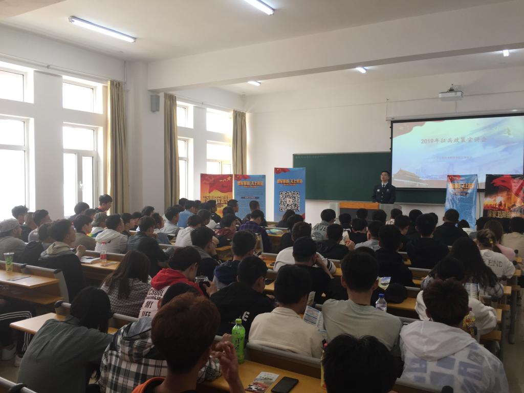 王云会作了2019年征兵工作的动员演讲,主要围绕大学生入伍意义、享受优抚政策、入伍流程等三个方面展开,通过具体实例为到场学生进行了详细的解读。阐述了大学生参军入伍对加强国防建设、实现强军目标的重要意义,激发了学生们携笔从戎报效祖国的热情,坚定了有意向参军入伍学生的信念。