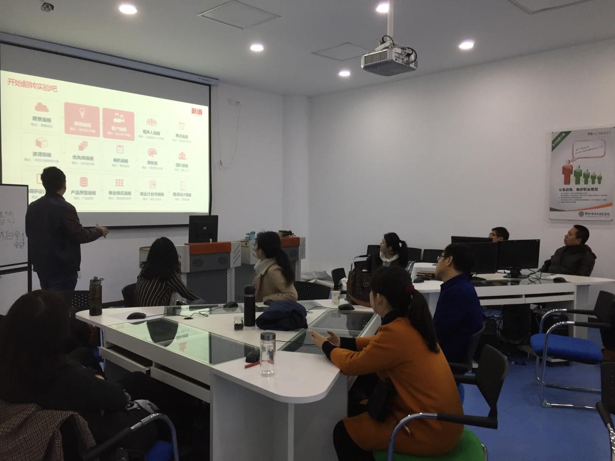 我校创业就业处邀请了新道科技股份有限公司培训讲师、创新创业导师谢鹏,有针对性地开展了“新道创业基础实训平台”培训。新道创业基础实训平台,是通过信息化技术与手段模拟创业项目筹备过程,解决大学生创业仿真实训的问题,适用于大学生《创业基础》课程的实训,通过激发学生创新创业意识,了解创新创业过程,掌握创新创业知识等环节,达到培养创新创业能力的效果。
