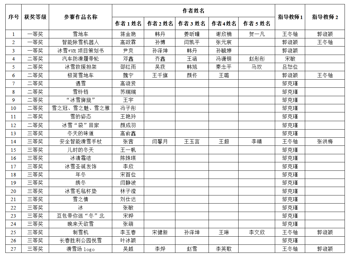 2018年12月28日,吉林省首届高校冰雪创意大赛在北华大学胜利闭幕。我校上报学生作品43项,荣获一等奖3项,二等奖9项,三等奖15项。机械学院的王冬轴、郭淑颖老师指导的参赛作品《雪地车》和郭淑颖老师指导的参赛作品《冰雪+VR项目策划书》在大会上进行了作品展示。