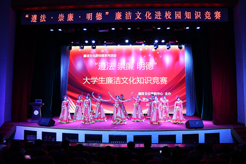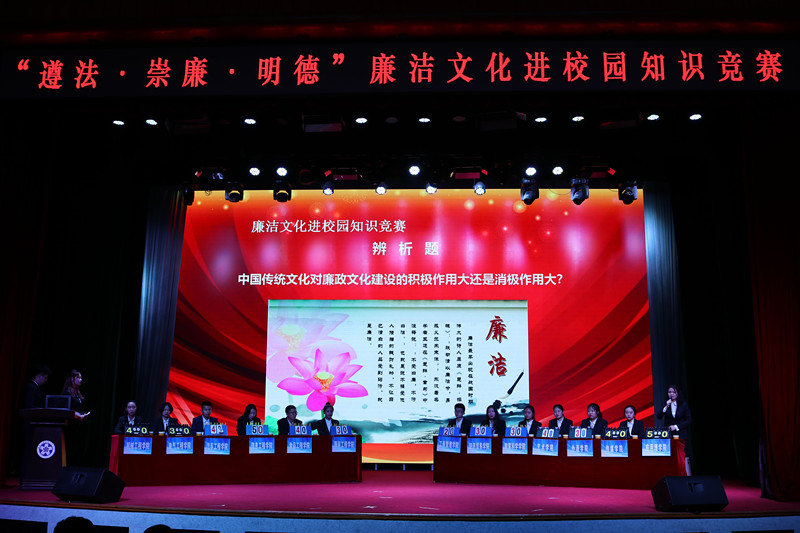 本次比赛分答题竞赛和文艺演出两个环节。答题竞赛分为必答题、抢答题和辨析题三种题型,来自我校的13个学院学生代表争相角逐,最后,来自应用理学院学院的付韵霏同学获得本次比赛的第一名。接下来,由艺术学院、食品工程学院、外语学院、信息工程学院为我们带来了精彩的文艺演出。通过廉洁文化进校园主题系列活动的激烈角逐,最终应用理学院获得总决赛的一等奖;信息工程学院、传媒学院获得二等奖;艺术学院、汽车工程学院、食品工程学院获得三等奖。