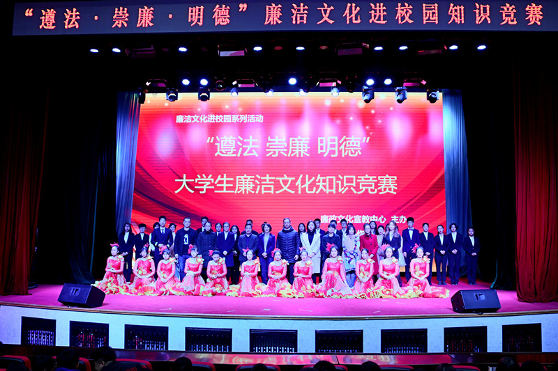11月14日下午,由廉政文化宣教中心主办、学生工作部承办的廉洁文化进校园系列活动总决赛--“遵法 崇廉 明德”大学生廉洁文化知识竞赛在我校报告厅举行。校纪委书记左伟教授,党委常委、教务处处长张存贵教授,学生工作部部长王宝龙出席本次活动;宣传部部长武德峰、纪检监察办公室主任刘琰、马克思主义学院院长王学军教授、学生工作部副部长刘晓敏、校团委书记邱敏担任本次比赛评委;各学院党总支副书记、分团委书记、辅导员老师以及各学院学生代表共同观看了一场精彩的比赛。