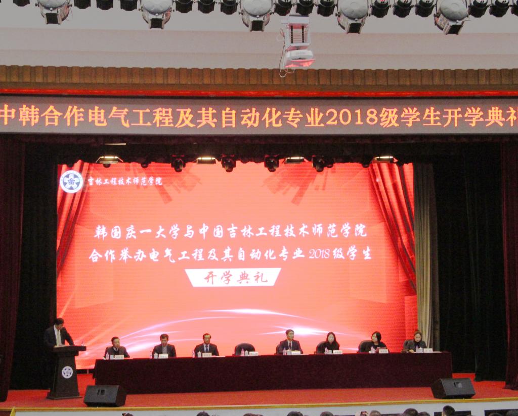 洪在杓在致辞中介绍了庆一大学的发展历史、办学理念及办学宗旨。他强调,此次合作项目是经过教育部批准,以吉林工程技术师范学院学生为对象,在吉林工程技术师范学院电气工程及自动化专业和庆一大学的电气工程学部之间实施共同教育的项目。学生前两年在吉林工程技术师范学院读大一、大二,后两年将在庆一大学读大三、大四,修满学分达到毕业标准将获得“2+2双学位”,是向参加中外合作办学和申请庆一大学学位的同学们发放指定奖学金的项目。洪在杓最后强调,人生的开始是年轻时代,现在正是大家开始生涯规划的最重要时期。在这样一个重要时期,韩国庆一大学会参与进来,为大家的幸福大学生活全力以赴。