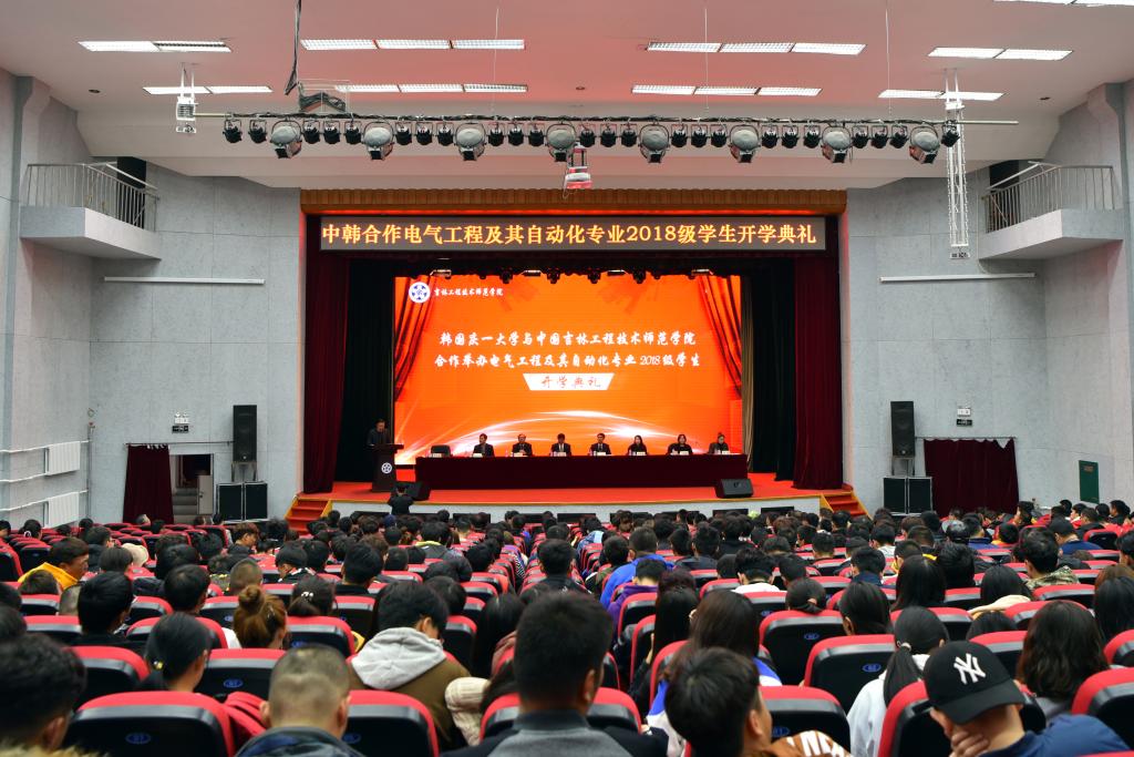 10月23日,学校在报告厅隆重举行中韩合作办学电气工程及其自动化专业学生开学典礼。韩国庆一大学副校长洪在杓、教务学籍处副科长李善爱、对外协力处副科长郑镇圭、机械汽车学部金红花,我校党委书记栾立明、校长杨晓东、党委常委教务处长张存贵出席了开学典礼。典礼由张存贵主持,国际交流处、学工部、校团委领导,电气工程学院党政领导、全体教师及大一新生参加了本次开学典礼。