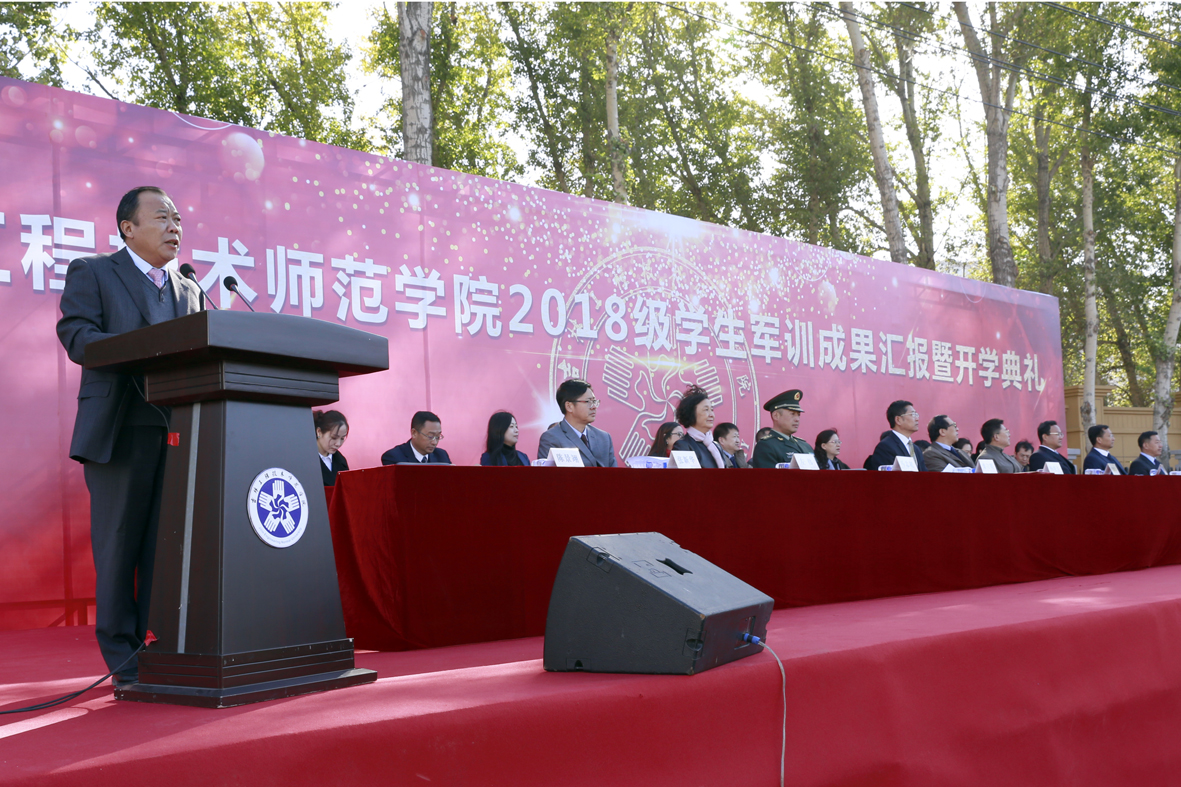 10月19日,学校2018级学生军训成果暨开学典礼于主校区操场隆重举行。学校党委书记栾立明、校长杨晓东、纪委书记左伟、副校长张鹏、党委副书记陈景翊、副校长宋立军,党委常委张新华、张存贵,各有关处室的负责人、各教学分院的院长、军训团全体成员出席大会。陆军装甲兵学院士官学校教练营营长马志超及教育厅体卫艺处处长杜颗亮作为特邀嘉宾莅临现场。大会由陈景翊主持。