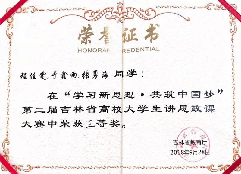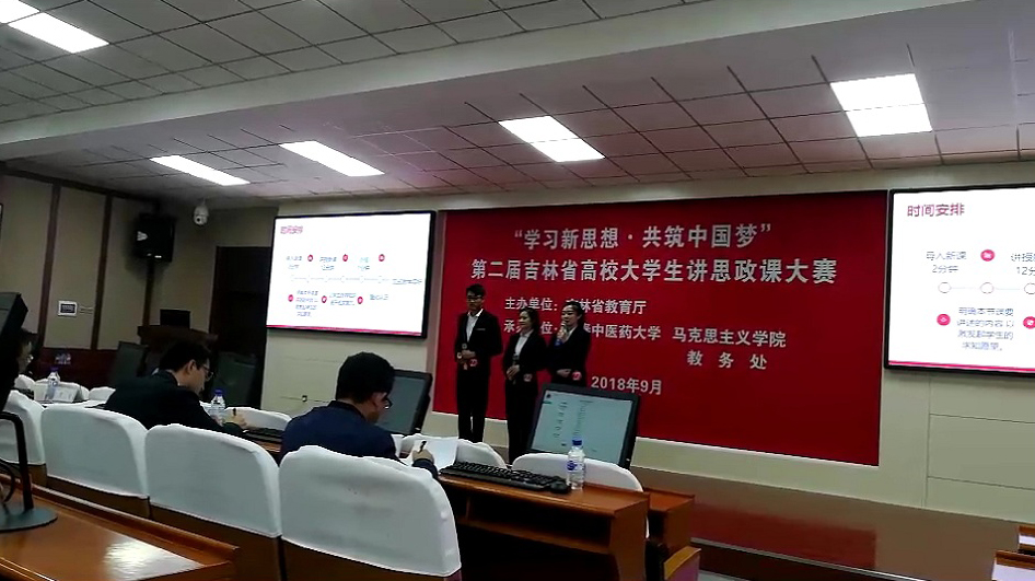 9月28日,“学习新思想 共筑中国梦”第二届全省高校大学生讲思政课大赛决赛在长春中医药大学举行。我校马克思主义学院代表队(负责人、主讲:程佳雯,成员:于鑫雨、张勇海;指导教师:孟翯巍)在本次大赛中荣获三等奖。