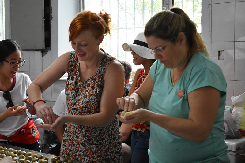 品葡萄美酒,尝中式传统小点心。食品工程学院结合自身特点,安排美国留学生参观我校葡萄酒厂,了解葡萄酒制作工艺与制作流程,品尝了我校葡萄酒厂制作的干红、冰葡萄与传统红酒;随后,美国同学还亲临我校食品制作实训室,观看老师制作中国传统小点心桃酥的制作全过程,参与其中与老师一同制作,最后品尝自己动手制作出来的无任何添加剂绿色美味的中国小点心……