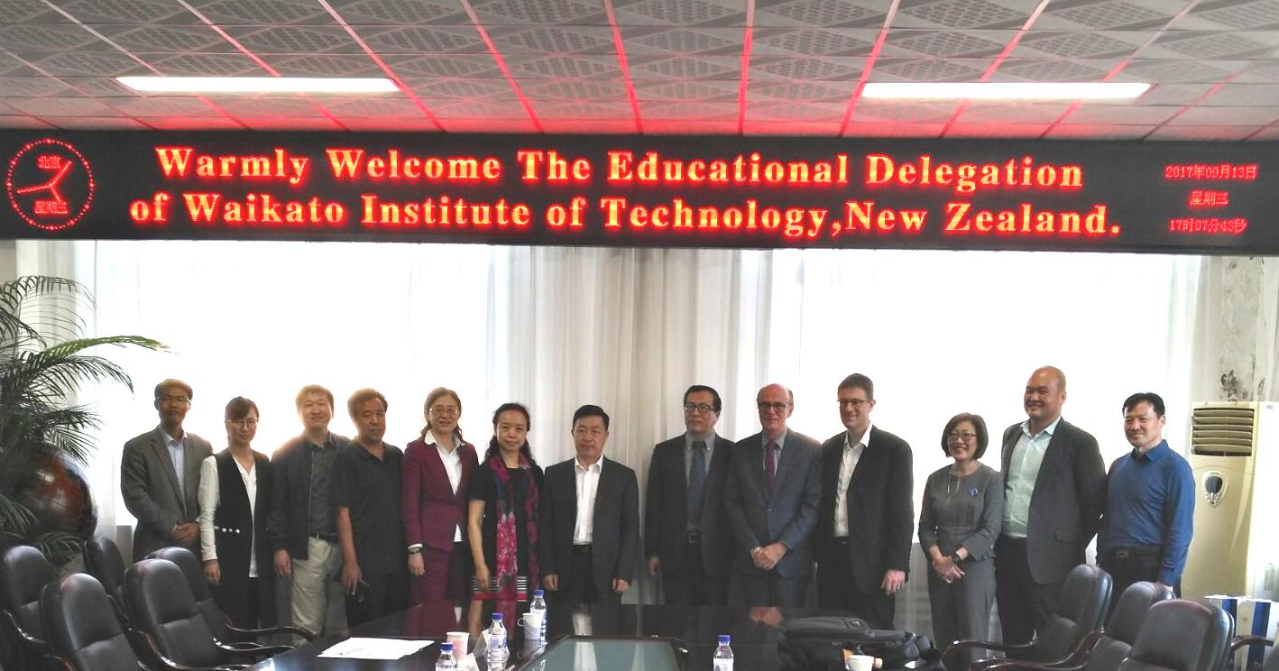 2017年9月13日,新西兰怀卡托理工学院校长马克、副校长大卫、理事会主席斯蒂夫、理事会成员孙谕冰、外事处主任刘马克及中新教育集团董事长周闻等一行六人来我校访问。教育合作洽谈在我校第一会议室召开。我校校长杨晓东、教务处处长张存贵、外语学院院长张丽梅、食品工程学院院长李皓、机械工程学院院长杨卓娟、电气工程学院院长许建平、信息工程学院副院长刘国成、外语学院副院长修杨以及国际交流处全体成员参与了此次会议。