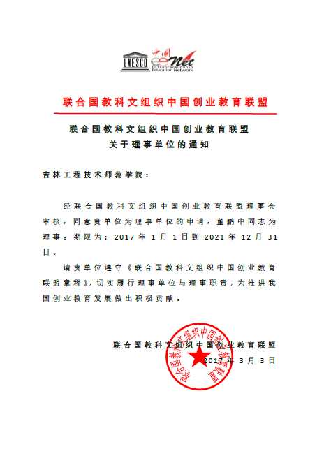 近日,经联合国教科文组织中国创业教育联盟审核,我校成为联盟理事单位,创业就业处董鹏中同志为联盟理事。