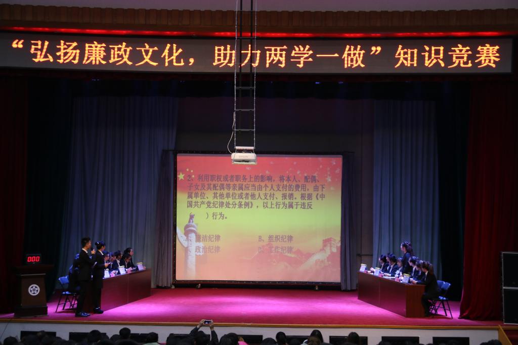 11月7日,“弘扬廉政文化,助力两学一做”知识竞赛决赛在报告厅举行。此次知识竞赛由校团委及纪检监察办公室联合举办,旨在深入贯彻党的十八届三中、四中、五中、六中全会精神,进一步深化我校党风廉政建设,在广大学生党员中深入推进“两学一做”学习教育,促使广大学生党员不断增强党员意识,自觉遵守党规党纪,切实发挥先锋模范作用,助推学校党建工作再上新台阶。