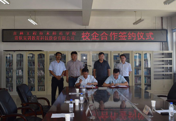 2016年7月15日上午8:00在新实验楼510举行了吉林工程技术师范学院信息工程学院与青软实训教育科技股份有限公司的校企合作办学签约仪式。我校校长栾立明、副校长刘君义、信息工程学院院长王朝勇和副院长刘国成,青软实训集团总经理李战军、东三省校企合作总监杨波,以及信息工程学院部分老师出席签字仪式。签字仪式由电子信息工程专业负责人王冬梅主任主持。