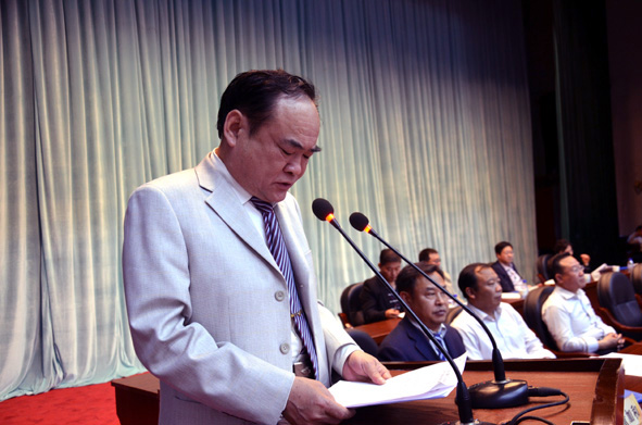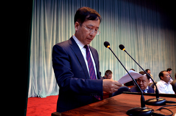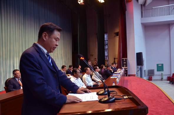 下午1时,大会在雄壮的国歌声中正式开幕。校长栾立明作《关于学校“十三五”事业发展规划编制情况的说明》,从编制背景、基本原则、编制过程、主要内容四个方面阐述了“十三五”规划的编制情况。栾立明指出,“十三五”规划的编制认真总结了“十二五”以来的实践经验,全面分析现有基础和发展潜力,多方面、多渠道听取广大师生和校内外专家的意见和建议,使规划制订的过程成为凝练思路、凝结智慧、凝聚人心的过程。学校党委高度重视“十三五”规划编制工作,在广泛研讨和征求意见的基础上,规划起草小组根据大家的意见和建议,力求完美,几易其稿,最终形成规划草案。十三五规划主要由五大部分组成:即发展形势、发展思路、发展目标、发展任务、保障措施;规划结合学校当前面临的形势,提出迁建带动、转型发展、科研提升、人才强校、特色发展五大战略,确定了新校区建设、人才培养、创业就业、学科建设、科技创新、师资队伍、国际交流、社会服务、文化建设九大任务,每项任务里面都明确了具体的工作任务。