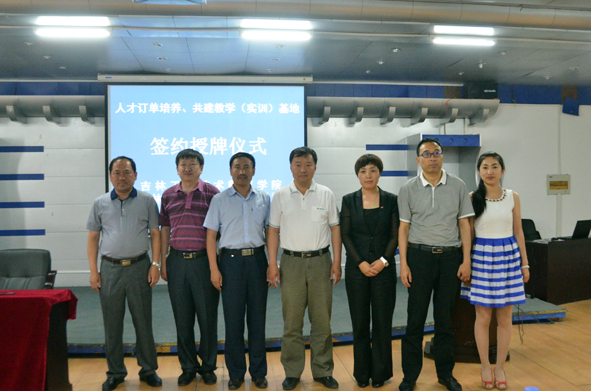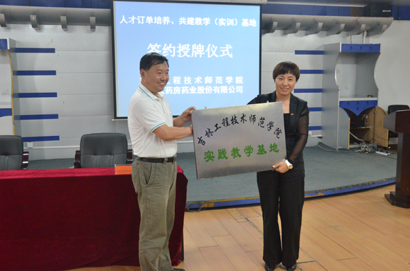 刘君义副校长和房云总经理助理分别代表双方共同签署了《吉林工程技术师范学院与吉林大药房药业股份有限公司实施订单培养、共建教学(实训)基地协议书》并相互颁发了《吉林工程技术师范学院实践教学基地》和《吉林大药房药业股份有限公司人才培养基地》牌匾。