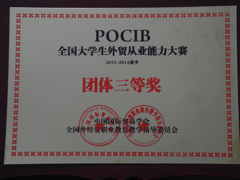 6月5日南京消息,由中国国际贸易学会和全国外经贸职业教育教学指导委员会举办的第三届POCIB全国大学生外贸从业能力大赛结果正式公布。此次比赛自4月16日开赛,5月9日结束。大赛采用网赛形式,参赛选手在各自学校内部的专业实训室参赛。经济贸易学院国际经济与贸易专业1141和1142班20名同学参加了这次比赛,这是我校学生第一次参加该项比赛。大赛组委会每天6:00-24:00点通过网络开通比赛系统。所有参赛队伍和选手都要在系统开通时间内“下单”,“开展外贸业务”,展示自己的外贸实战技能和战略策略思想。经过大家24天的不懈努力和激烈角逐,我校代表队获得了团体三等奖,张栋梁、王雪、熊思婕和张天琪同学分别获得了个人三等奖,叶万军教授和国际经济与贸易教研室主任王芳教授分别获得了指导教师三等奖。通过参加这次技能比赛,同学们学到了很多在理论教学课堂上学不到的知识和技巧,为今后走向外贸实际工作岗位奠定了良好的基础。