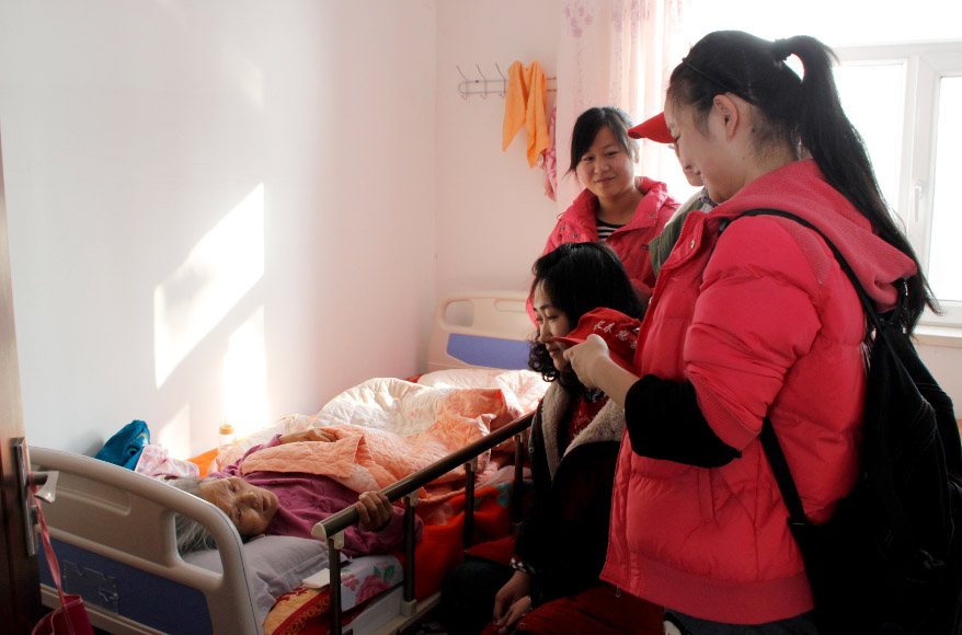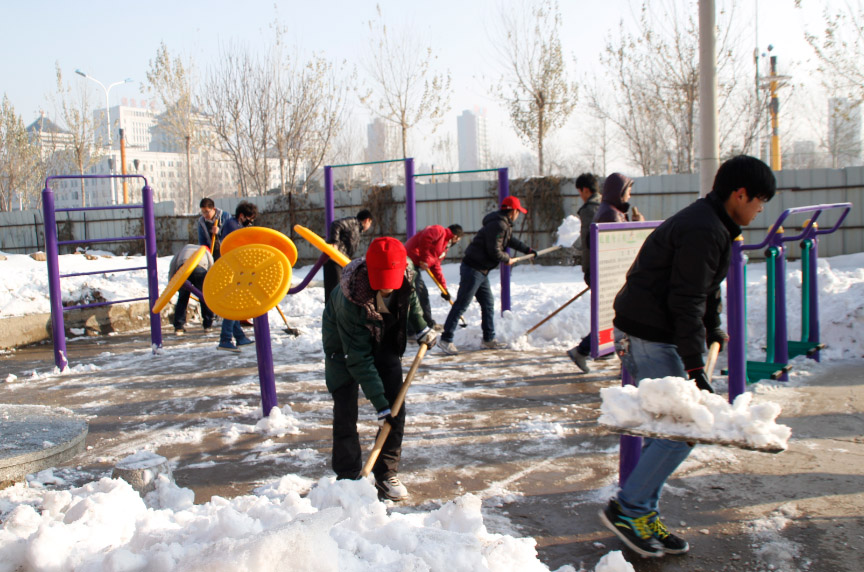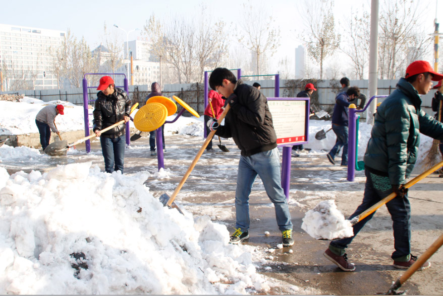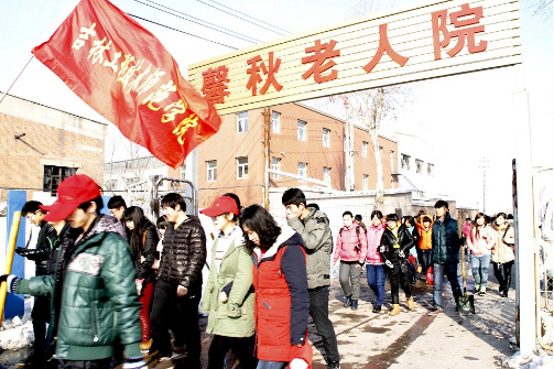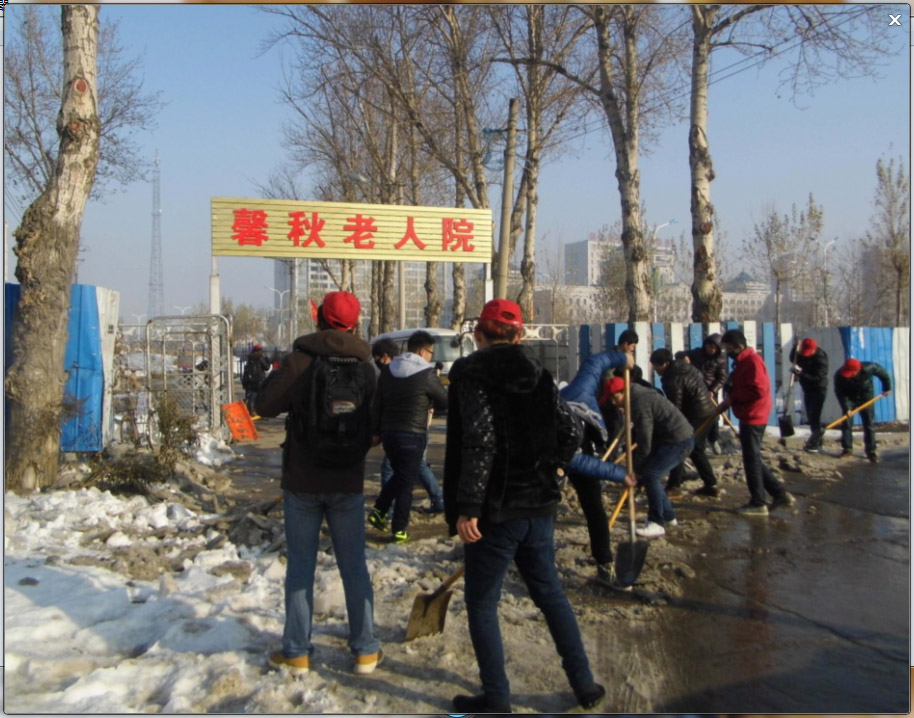 艺术学院的志愿者们一大早在学校集合完毕,扛着除雪工具,带上了大家准备的糕点和水果,打着火热的团旗和校旗,戴着耀眼的小红帽,整齐有秩序的列队向馨秋老人院进发。上午九点整志愿者们到达了老人院,副院长程义春同志和老人们热情的接待了志愿者们,老人们见到来了这么多青年志愿服务的大学生们高兴的合不拢嘴。志愿者们一起和老人们见面交谈并送上慰问品,细致的询问了都有哪些需要帮助和服务的地方。从与老人们交谈中得知院子里的积雪正是困扰老人们不方便出入晒太阳特别是活动区内健身器材场地也都被大雪掩盖的了无法使用,志愿者们马上行动起来进行了分工分组,开始了清雪工作。由于积雪时间过长,给志愿者们铲雪带来了不小的难度。在扫雪过程中不时的有老人叫志愿者们进屋去取暖,还有老人给志愿者们送来了热水,让志愿者们深深感受到了老人们对青年人的爱护和关怀。在大家的齐心协力下,历时了两个多小时的劳动终于圆满完成了扫雪和室内的打扫任务,一个整洁温馨的小院呈现在老人们的眼前。敬老院的75岁的 周景合老人激动的说:“谢谢你们这些孩子,冻坏了吧!你们能来劳动,还这么多人看我,真是高兴啊,我高兴!”72岁来自九台的杨秀芝老人紧握着志愿者陈文丽同学的手说:“真的好喜欢你们这些孩子们,这里的环境好,有你们就更开心了!以后要常来看我们啊!”志愿者徐林军同学说:“参加这样的活动很有意义,也是我们应该做的,用我们的微薄之力贡献我们的一片爱心,希望我们的行动能带动更多的人来关注社会和需要我们帮助的弱势群体,因为我们社会会更加美好。”志愿者说的好,这是当代青年团员应该做的,这是年轻人感恩回报社会力所能及的一种表达方式,这是互帮互助和谐社会的体现,和谐社会,幸福长春!