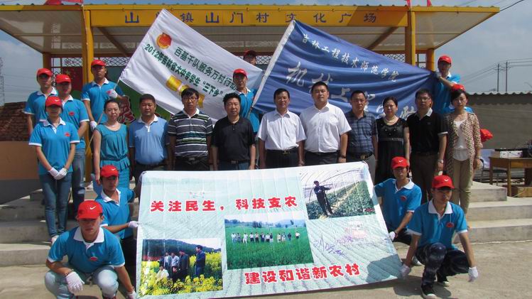 为响应团中央贯彻和落实胡锦涛总书记在纪念建团90周年大会上的重要讲话的精神,进一步引导广大青年学生为“十二五”和社会主义新农村建设作贡献,假期,机械工程学院“践行者”实践队16名队员在分团委老师的带领下来到了四平市山门镇山门村,在此开展了以“关注民生,科技支农,共建和谐新农村”为主题的大学生暑期三下乡社会实践活动。