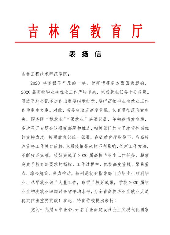 2020年12月28日,我校收到吉林省教育厅关于2020届毕业生就业工作的表扬信,表扬我校2020届毕业生初次就业率超过全省平均水平,为全省高校毕业生就业大局稳定作出的重要贡献。2020年就业工作面临毕业生规模创历史新高、新冠肺炎疫情突然袭来的多重压力,全校上下群策群力,千方百计稳就业。学校先后组织召开9次就业工作推进会,落实“三包一保”就业工作责任制和“一把手”工程。积极打造线上就业服务平台、开辟24小时线上全流程...