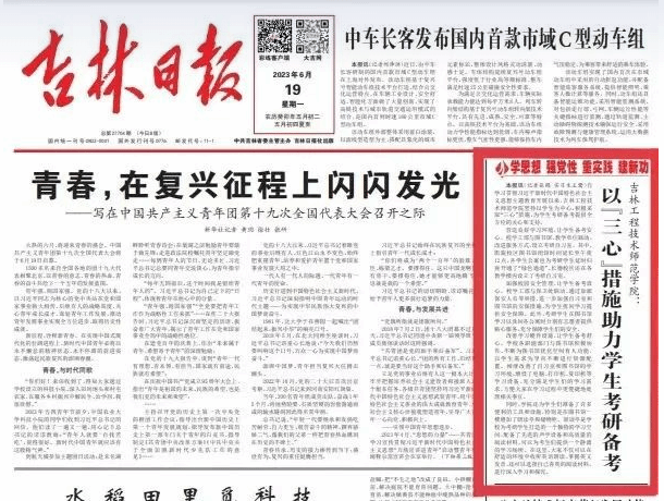 2023年6月19日,吉林日报对我校主题教育学习成效:以“三心”措施助力学生考研备考进行报道。自学习贯彻习近平新时代中国特色社会主义思想主题教育开展以来,吉林工程技术师范学院坚持以学生中心,积极采取“三心”措施,为学生考研备考提供全方位的关心和支持。营造良好学习环境,让学生备考安心。校学工部与图书馆、教学单位联动,改进服务方式,设立考研自习室。其中,凯旋校区图书馆闭馆时间延长至午夜12点,各学生公寓也为考研学生延时归寝开通了“...