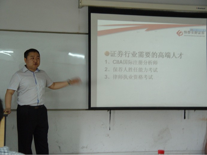 经济贸易学院举办恒泰长财证券首席讲师专题报告会 2013年6月26日,经济贸易学院邀请长春市恒泰长财证券首席讲师潘奕霖及首席技术分析师吴鹏为我校2011和2012级投资学专业学生做了关于就业和证券投资相关专业知识的专...