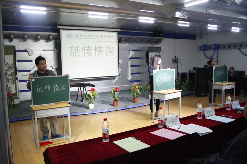 “熊罴之祥”、“累瓦结绳”、“风声鹤唳”、“冥顽不灵”……每当主持人读出一个词语,台上的选手们都凝神静气,仔细聆听,一笔一划地用粉笔在小黑板上认真地书写,生怕出现一点点失误。