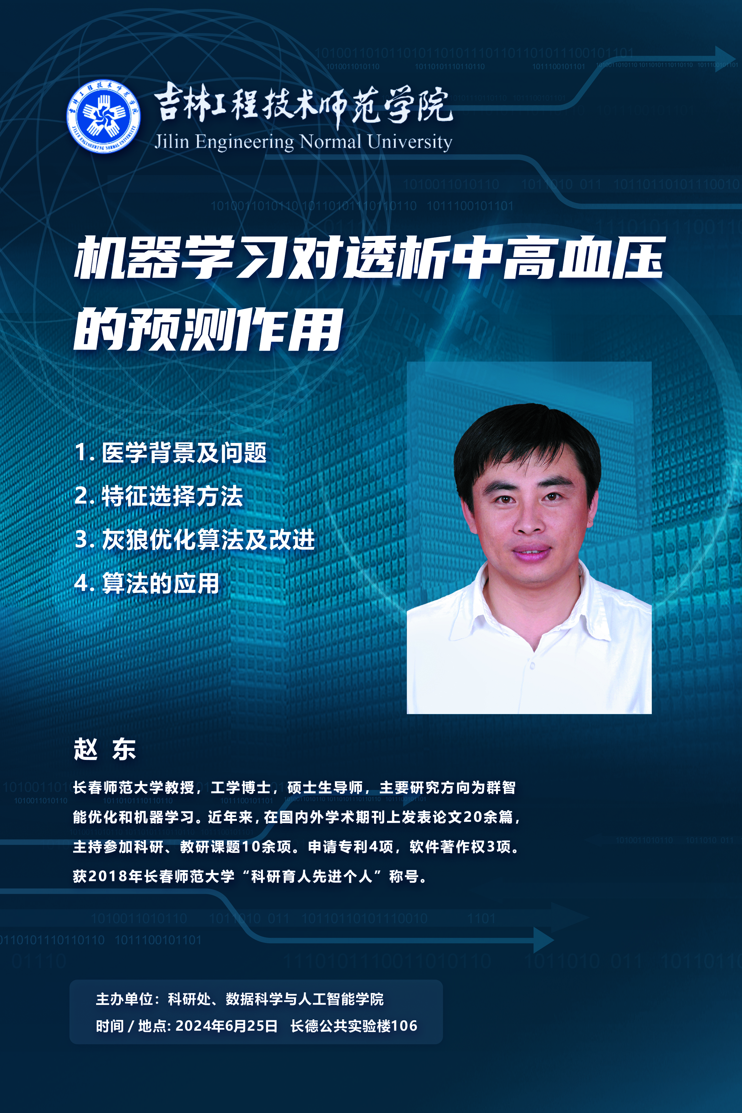 主讲人:赵东,长春师范大学,教授时间、地点:2024年6月25日 13:30 长德公共实验楼106主办单位:数据科学与人工智能学院、科研处讲座内容:1.医学背景及问题;2.特征选择方法;3.灰狼优化算法及改进;4.算法的应用。