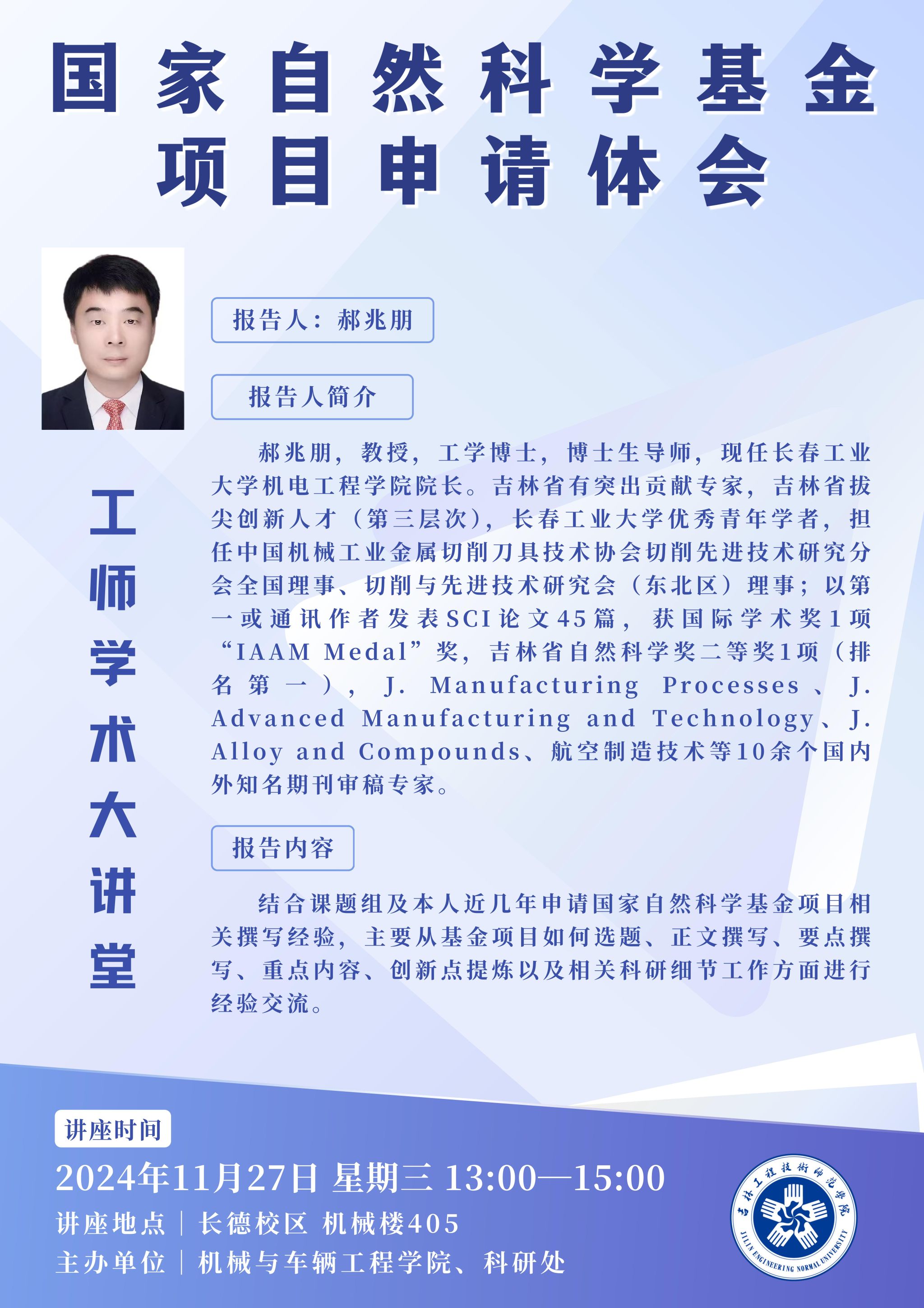 主讲人:郝兆朋 ,长春工业大学教授 长德校区机械楼405时间、地点:2024年11月27日13:00 主办单位:机械与车辆工程学院、科研处讲座内容:1.申请国家自然科学基金项目的前期准备;2.撰写经验分享;3.申报过程中的其他注意事项。
